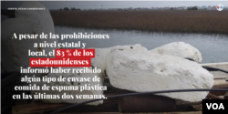 A pesar de las prohibiciones a nivel estatal y local, el 83 % de los estadounidenses informó haber recibido algún tipo de envase de comida de espuma plástica en las últimas dos semanas. Ocean Conservancy estima que al menos 5.600 millones de piezas de espuma plástica son utilizadas por los estadounidenses cada año.