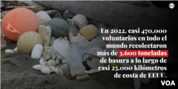En 2022, casi 470,000 voluntarios recolectaron más de 3.600 toneladas de basura a lo largo de casi 25.000 kilómetros de costa en Estados Unidos. Los artículos más encontrados a nivel global fueron colillas de cigarrillos (casi 844 toneladas), botellas de bebidas de plástico (más de 534 toneladas) y envoltorios de comida de plástico (454 toneladas).