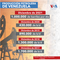 Venezuela inició el año 2021 produciendo un promedio de 530.000 barriles al día. La crisis económica nacional, marcada por la hiperinflación, coincidió con el desplome de su producción petrolera. Se calcula que esa industria aportaba hasta el 95% del producto interno bruto del país suramericano.