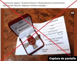 Otro ejemplo de esta discrepancia y cómo ha sido un factor determinante a la hora de identificar una desinformación es esta imagen de medallas ucranianas “por la captura de Crimea” que habrían sido encontradas en Kherson. Supuestamente, las medallas habrían sido entregadas “por orden del presidente de Ucrania”, iniciales “V. A. Zelenskyy”.