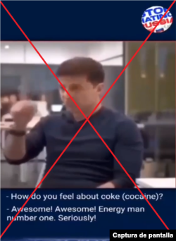 Otro ejemplo de subtítulo falso comenzó a circular en abril de 2022 según el cual Zelenskyy afirmaba ser ávido consumidor de drogas. En los siguientes segundos, los subtítulos indicaban falsamente que el mandatario habría dicho frases como “es energía para todo el día”, “me levanto, paseo al perro, y esnifo drogas” o “advierto a la gente que no tome drogas duras, te dan ganas de dormir durante el día”.