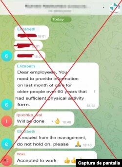 Un mes antes, circuló que Ucrania estaba solicitando información médica de hombres de más de 60 años “en buena forma” para que puedan unirse al ejército. En este caso, quien difundió el mensaje en Telegram aseguró que se apunta a este sector de la población porque “no es pérdida”. Para sustentar esta afirmación, se difundió una captura de una conversación que se habría dado en un grupo de chat de enfermeras del servicio de cuidados Nadia: