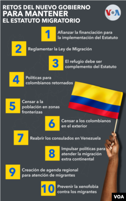 De acuerdo con la politóloga María Clara Robayo, de la Universidad del Rosario, la prioridad del nuevo presidente de Colombia en materia migratoria será afianzar la financiación con recursos públicos y de cooperación internacional para dar continuidad al Estatuto. La experta relató a la VOA que el Estado debe empezar por mantener los compromisos adquiridos en el decreto del presidente Iván Duque. “Un decreto que permite la regularización, ayuda e incentivación a la integración de los migrantes por 10 años en Colombia”.