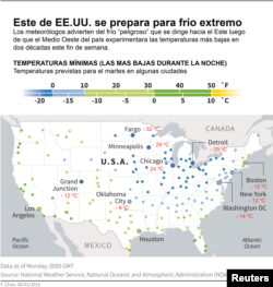 El Servicio Meteorológico Nacional ha dicho que la masa de aire frío es "peligrosamente helada" y ha advertido que casi la mitad de la nación, alrededor de 140 millones de estadounidenses, enfrentará temperaturas de 30 a 48 grados Celsius por debajo de cero en la costa Este.