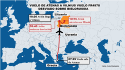Pratasevich, exdirector de los influyentes canales Nexta y Nexta Live de Telegram, fue detenido por la policía después de que su vuelo de la aerolínea Ryanair desde Grecia a Lituania fue desviado en el espacio aéreo de Bielorrusia cuando el gobierno de Minsk dijo que Lukashenko ordenó a sus militares enviar un caza Mig-29 para escoltar el avión.