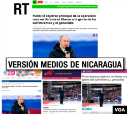 La imagen de un hombre fuerte, rodeado por sus simpatizantes y hablando de la decisión de “liberar a la gente del sufrimiento y del genocidio” fue la que predominó en los medios digitales en Nicaragua controlados por el gobierno Ortega el pasado 18 de marzo cuando Vladimir Putin apareció públicamente luego de anunciar “una operación militar” en Ucrania. Exactamente la misma versión publicada por el canal RT, fue republicada por los medios controlados por los Ortega.