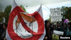 Manifestantes protestaron por la visita de Trump, como lo hicieron en Gran Bretaña. Una pequeña multitud de unas 200 personas se reunieron en un "campamento de paz" establecido fuera del aeropuerto de Shannon durante la duración del viaje. Se planea una protesta más grande para Dublín el jueves.