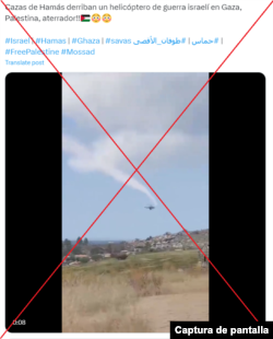 En el contexto del conflicto armado entre Israel y el grupo terrorista Hamás, el pasado 7 de octubre se difundió un video en el que supuestamente "cazas de Hamás" derribaban un helicóptero de guerra israelí. El video incluye sonidos de lanzamiento de misiles y diálogos entre militares, así como muestra una secuencia fluida de los acontecimientos.